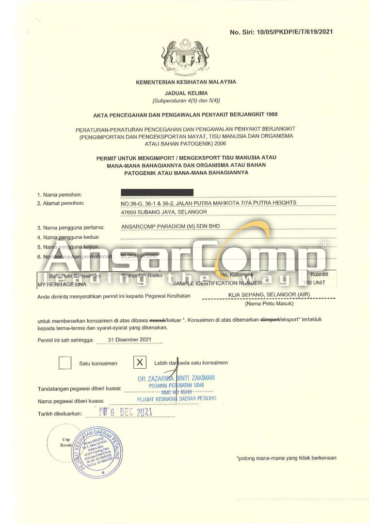 Ansarcomp is an expert to assist clients in getting such approval. Regardless you are an individual or group, you rest assured of obtaining your ancestry or health result with ease. Asides from being an expert in getting the approval, should you are a manufacturer or laboratory that conduct the test, we are a reliable and trusted partner in Malaysia that can be your Exporter of Record (EOR) in managing and getting your end consumers to do the test and sending the kits back to you for analysis with hassle-free.