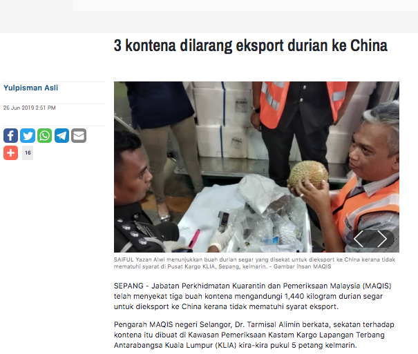 Jabatan Perkhidmatan Kuarantin dan Pemeriksaan Malaysia (MAQIS) telah menyekat tiga buah kontena mengandungi 1,440 kilogram durian segar untuk dieksport ke China kerana tidak mematuhi syarat eksport.